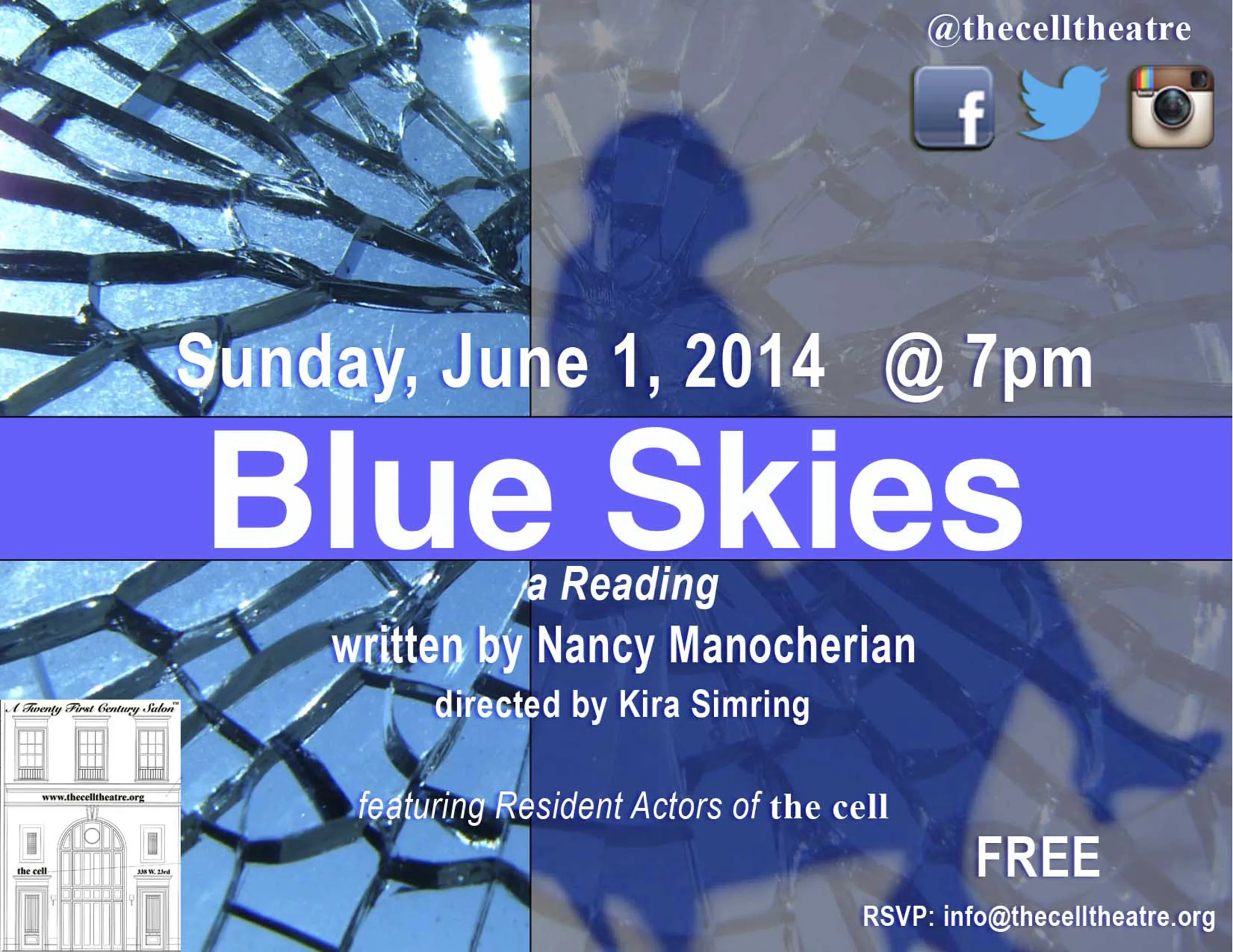 Blue Skies - 7:00 pm Sunday, June 1, 2014 7:00 PM 9:00 PM 19:00 21:00 Google Calendar ICS View fullsize A woman, a man and their son face a crisis while reckoning with a ghost from the past.RSVP: info@thecelltheatre.org FREE