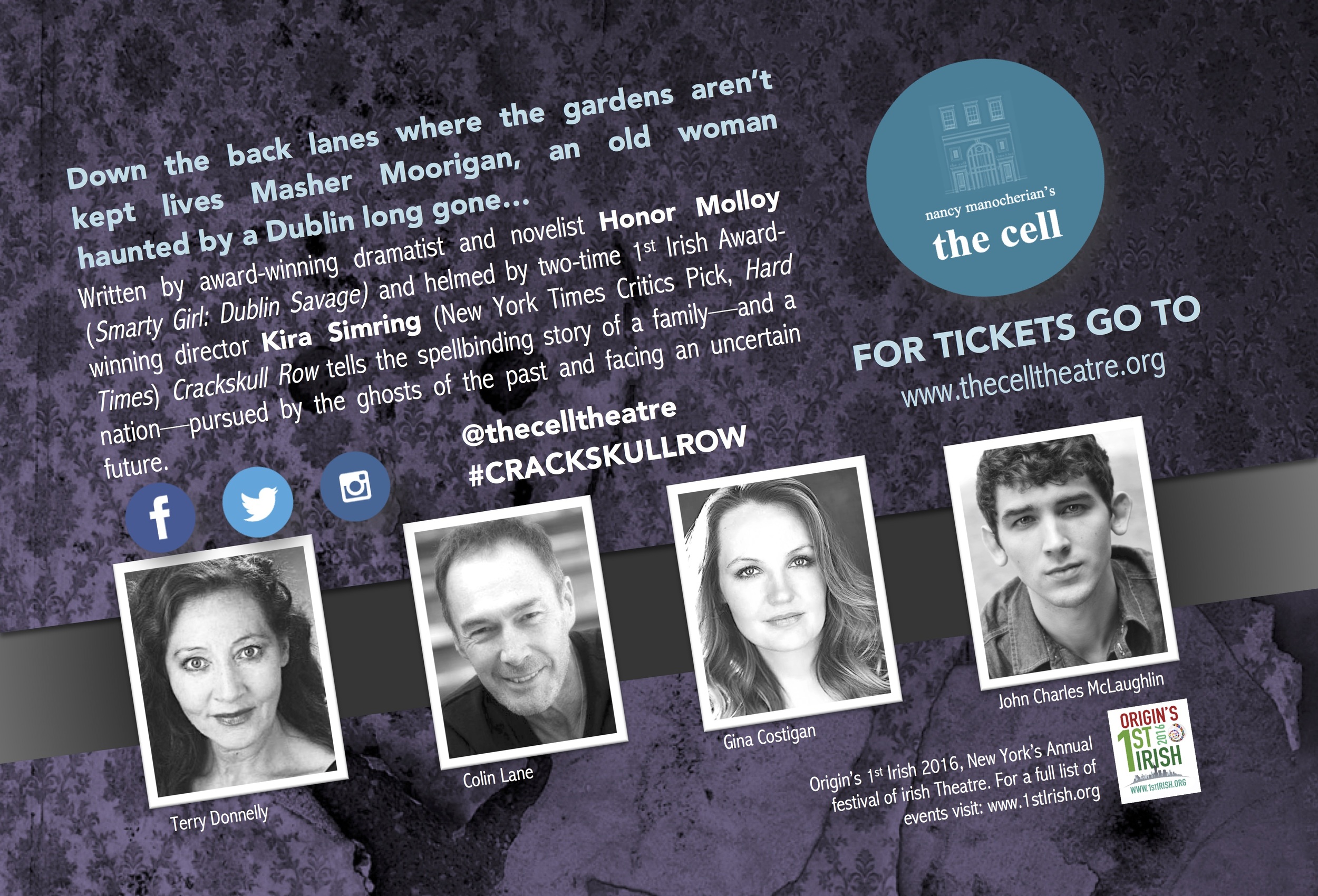 CRACKSKULL ROW is set in 1999. Rasher Moorigan has finally been released from prison after serving time for a monstrous crime he committed over thirty years before. After reuniting with his mother, an old woman haunted by a vanished Dublin, they confront the ghosts of the past and an uncertain future. Melding reality and myth, CRACKSKULL ROW is the story of one Irish family’s desperate actions and forbidden loves.